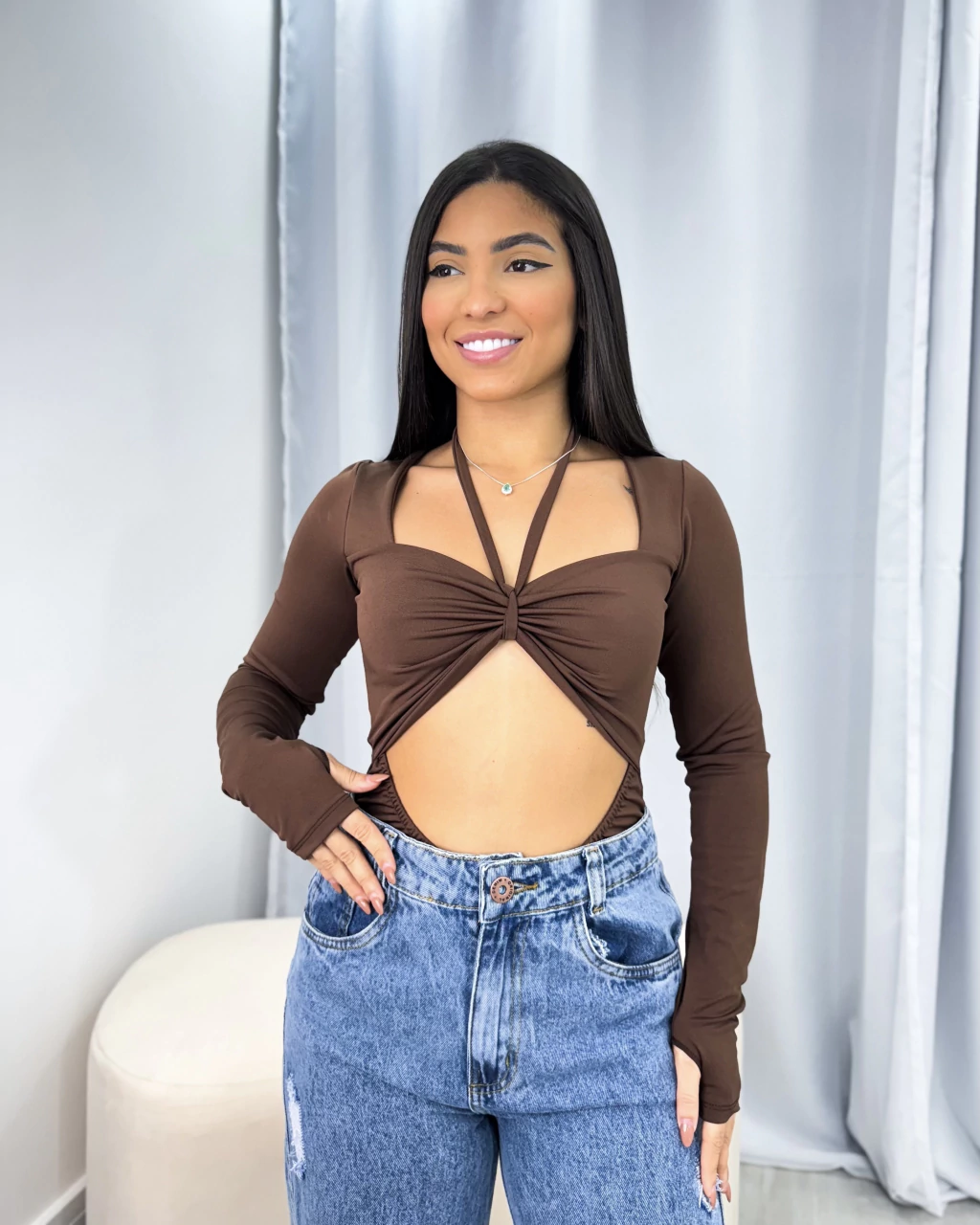 Confeccionado em tecido suplex com poliamida, o Body Medusa possui mangas longas e forro duplo no busto, garantindo conforto. Seu diferencial está na amarração versátil, que pode ser usada no pescoço ou em laço no decote, proporcionando um visual super estiloso.