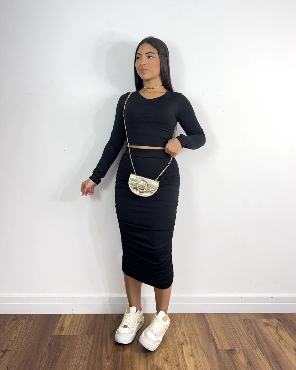 Conjunto midi básico que combinado com todo tipo de calçado. No tecido suplex, possui bojo e drapeado nas laterais da saia
