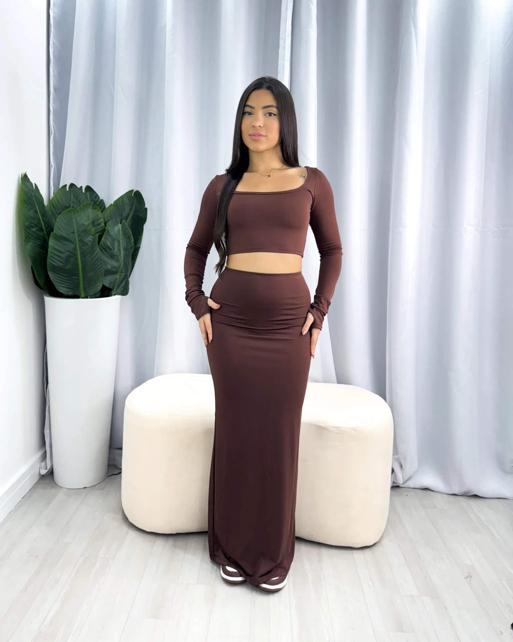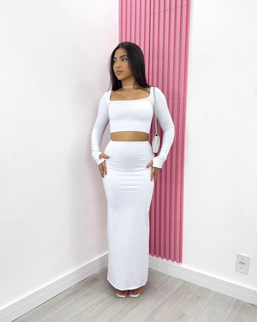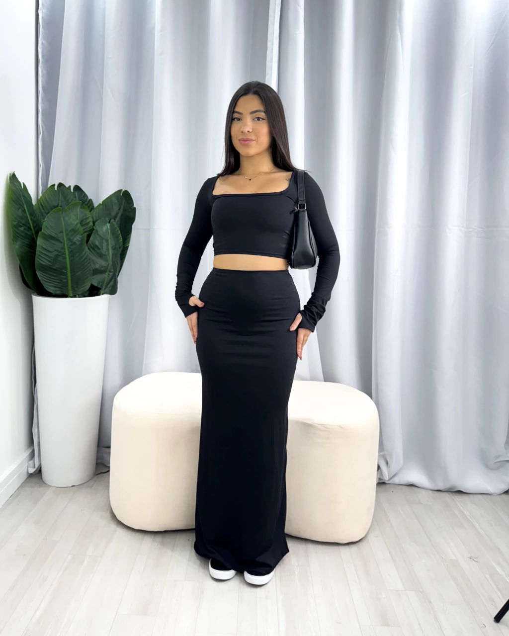 Com design moderno, o conjunto possui decote quadrado que valoriza o colo, e mangas longas que proporcionam um toque sofisticado. Além disso, a peça é sem bojo, oferecendo naturalidade e leveza ao vestir.