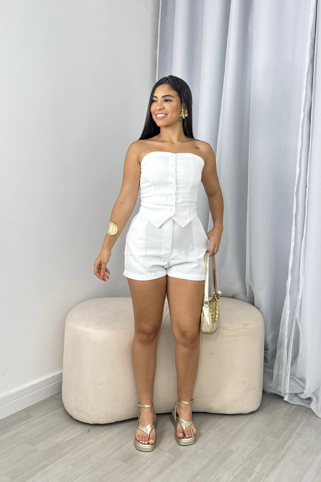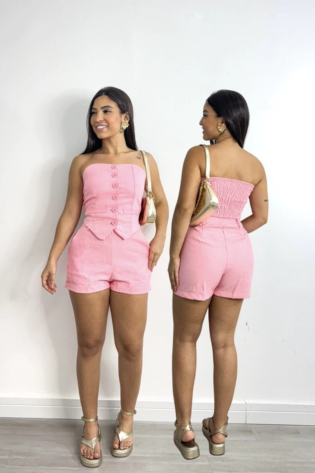 Este conjunto combina um short confortável e um corpete com fechamento em botões, perfeito para quem quer manter o estilo sem abrir mão do frescor. A modelagem ajustada valoriza a silhueta, enquanto o tecido leve garante conforto durante todo o dia.