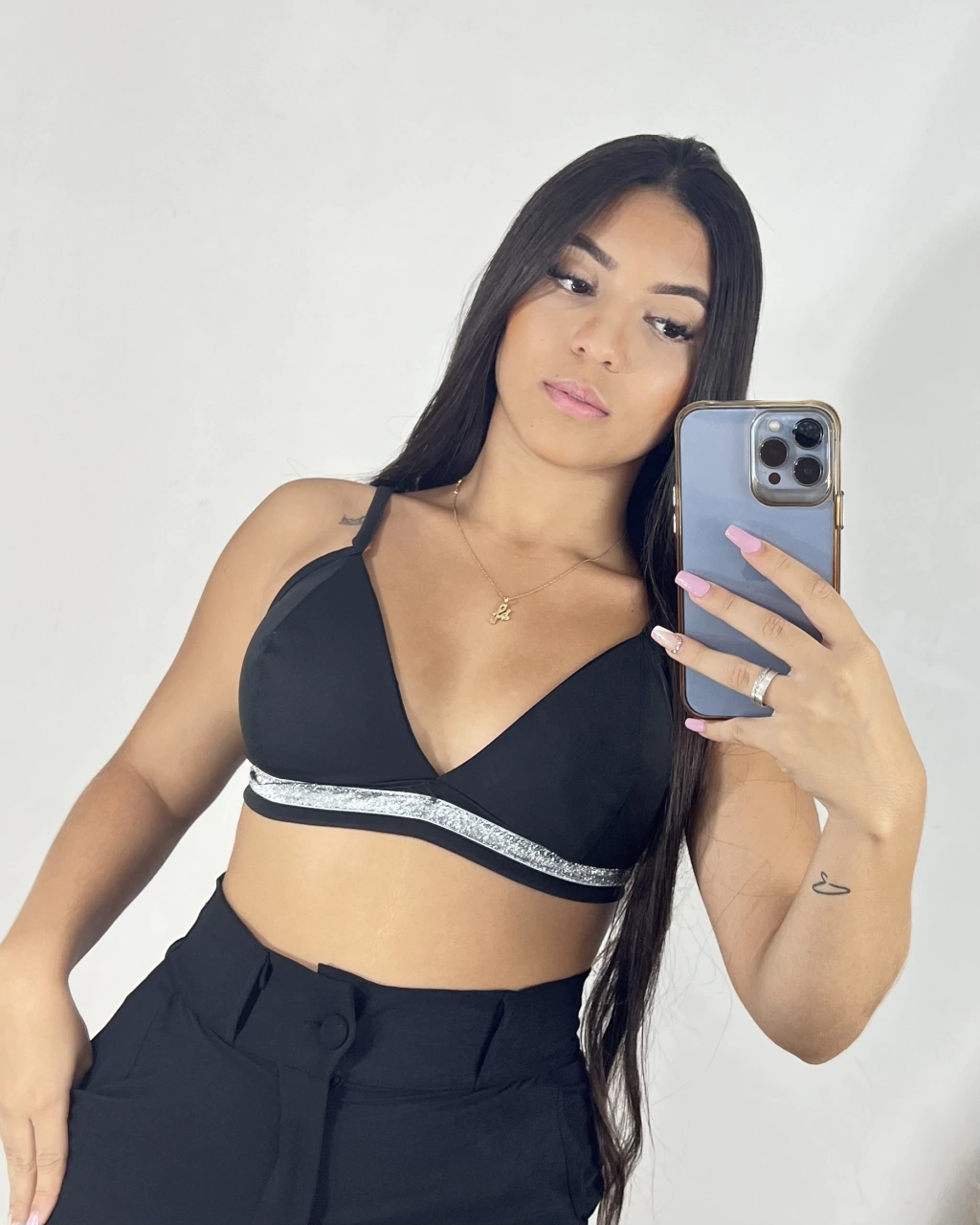 Tecido alfaiataria, possui bojo e amarração estilo biquíni. Veste do P ao G.