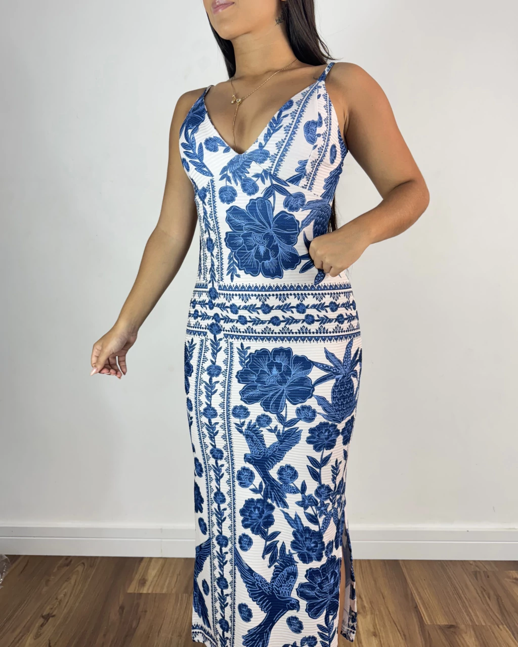 Este vestido estampado é confeccionado em tecido canelado premium, que proporciona um caimento encorpado e veste mega bem. Com um decote em V e bojo, ele valoriza a silhueta, enquanto a amarração nas costas oferece um ajuste perfeito. As fendas laterais acrescentam um toque moderno e sensual.